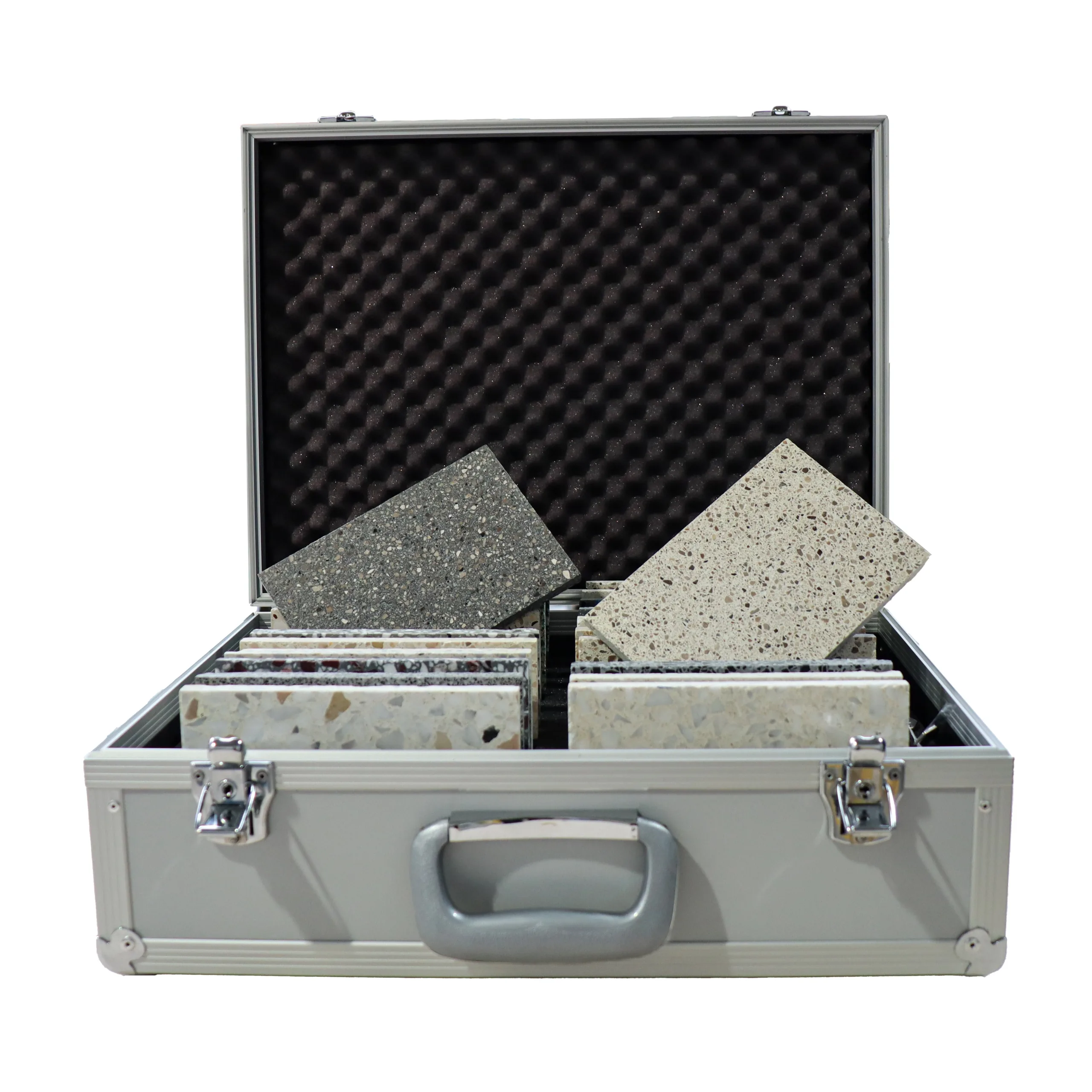 Musterkoffer mit ausgewählten Gussterrazzo-Oberflächen für Präsentation, Beratung und Kundengespräche.